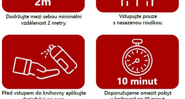 Jaká jsou pravidla? Zaměstnanci i návštěvníci musí nosit roušky, zaměstnanci používají rukavice při manipulaci s knihami a periodiky, u vstupu do knihovny každý uživatel by měl provést dezinfekci rukou, taktéž při odchodu, vrácené knihy jsou umístěny na samostatném místě a zde stráví týdenní „karanténu“, poté se omyjí dezinfekcí a vrátí do oběhu, čtenáři budou odečteny z konta s týdenním zpožděním. Návštěvníci knihovny musí dodržovat dvoumetrové odstupy, pobyt uvnitř knihovny je omezen na 10 minut, maximální počet osob na oddělení je 5, veřejný internet, místa pro studium, wc pro veřejnost zůstanou zatím mimo provoz (do odvolání), knihovna omezuje svou činnost na výpůjční služby.