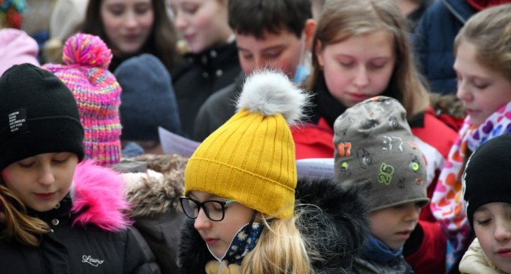 Žáci Základní školy Školní Louny za doprovodu Evy Maťátko zazpívali vánoční koledy pod okny Domova seniorů U Pramene Louny.