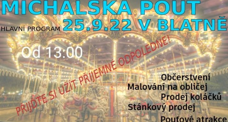 Sobota – neděle 24. - 25. 9. MICHALSKÁ POUŤ - pouťové atrakce (od 11 hodin), občerstvení už od soboty. Hlavní program v neděli - prodej koláčků, malování na obličej, stánkový prodej, kolotoče. Přijďte si užít příjemné odpoledne. Náves u KD. Od 13 hodin.