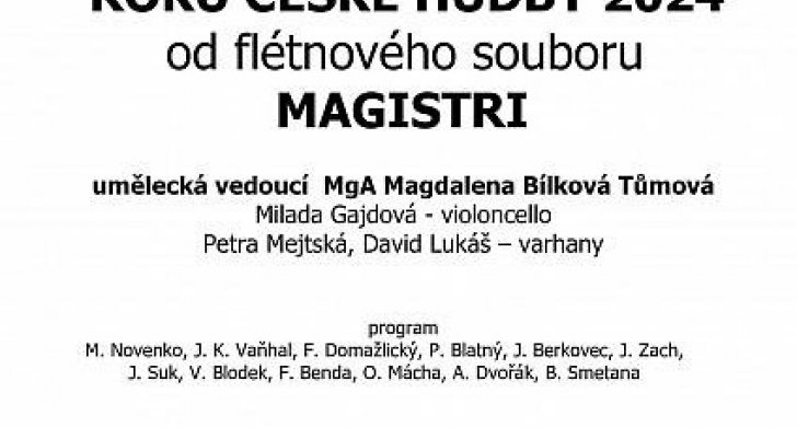 11. 5. (16 h) MAGISTRI. Pocta hudebním tvůrcům ROKU ČESKÉ HUDBY 2024 od flétnového souboru MAGISTRI. Umělecká vedoucí Magdalena Bílková Tůmová, Milada Gajdová - violoncelo, Petra Mejtská a David Lukáš - varhany. Vstupné zdarma.