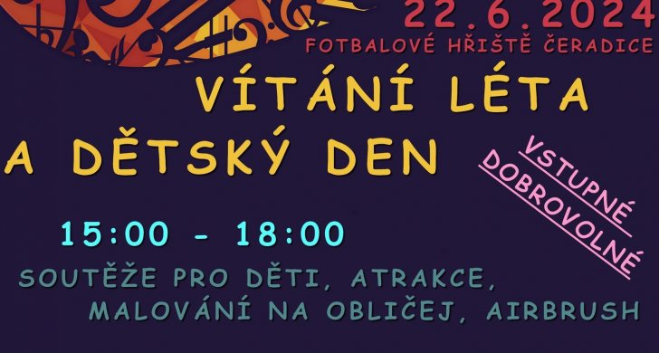 23. 6. (14 h) SPORTOVNÍ DĚTSKÝ DEN. Odpoledne plné soutěží, pěna od hasičů, skákací hrady, bublinkovač, malování na obličej, vzduchovky. Občerstvení zajištěno. Vstupné dobrovolné. Po děti párek v rohlíku a nanuk zdarma. Za obecním kinem.