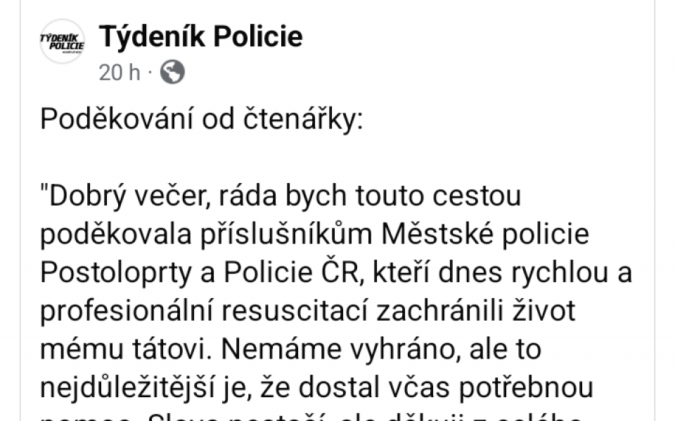 Brzy po úspěšné záchraně dorazilo policistům poděkování od dcery muže. „Ráda bych poděkovala příslušníkům Městské policie Postoloprty a Policii ČR, kteří rychlou a profesionální resuscitací zachránili život mému tátovi. Nemáme vyhráno, ale to nejdůležitější je, že dostal včas potřebnou pomoc. Slova nestačí, ale děkuji z celého srdce.” Napsala na facebookový profil Týdeníku policie. (lus, mp)