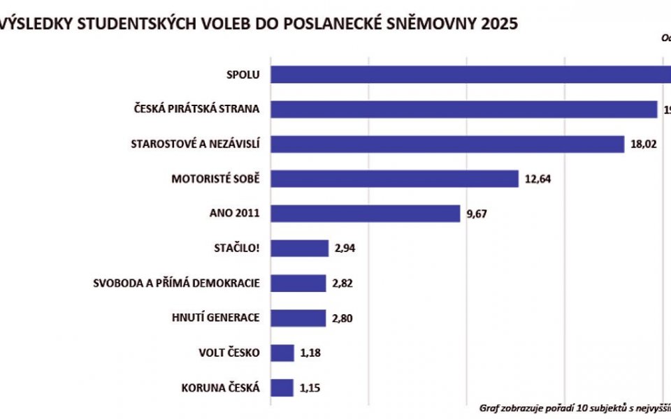 Region - Na polovině českých středních škol proběhly před parlamentními volbami Studentské volby do Poslanecké sněmovny Parlamentu ČR. Výsledky voleb v řádném termínu odeslalo 637 škol, platný hlas odevzdalo 90 820 studentů. Projekt na podporu aktivního, zodpovědného a sebevědomého občanství budoucích prvovoličů uspořádal již pošestnácté vzdělávací program Jeden svět na školách společnosti Člověk v tísni. Největší počet hlasů od středoškoláků získala koalice SPOLU (20,60 %), za ní následuje Česká pirátská strana (19,70 procenta) a hnutí Starostové a nezávislí (18,02 procenta). Další strany, které dosáhly pětiprocentní hranice, jsou Motoristé sobě a ANO 2011. ,,Největší přízni studentů se stejně jako ve Studentských volbách v roce 2021 těší politické subjekty, které následně sestavily vládní koalici, tedy SPOLU, Česká pirátská strana a Starostové a nezávislí. I součet získaných hlasů těchto uskupení je velmi podobný, letos 58,3 %, v roce 2021 59,8 %. Pořadí na prvních třech místech je po-měrně těsné. Hnutí ANO 2011, favorit říjnových voleb, u náctiletých nedosáhlo na dvouciferný výsledek. Neuspěly Stačilo! a Svoboda a přímá demokracie, oba subjekty získaly pod 3 % hlasů,“ říká ředitel Jednoho světa na školách Karel Strachota.