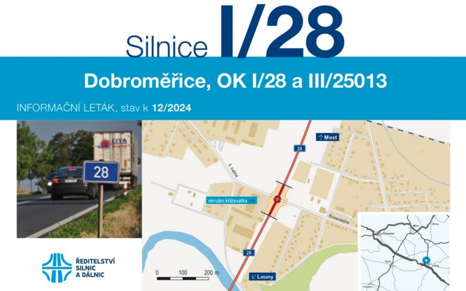 ,,Ředitelství silnic a dálnic zahájí stavbu nové okružní křižovatky na silnici I/28 u Dobroměřic v první polovině roku 2026. Stavba začne v termínu odpovídajícím vhodným klimatickým podmínkám, aby mohla proběhnout plynule a v co nejkratším čase,“ uvedla mluvčí ŘSD Kamila Zahálková.