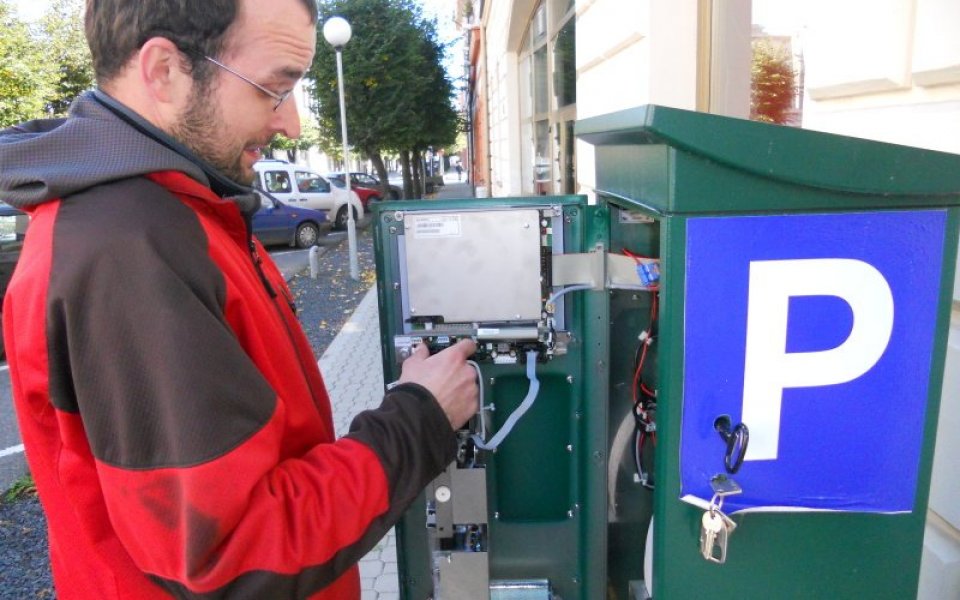 Louny – Hned 1. října, kdy začalo platit radou města Louny schválené snížení ceny parkovného v části ulice Na Valích, upravovali zaměstnanci společnosti Eltodo výběrní parkovací automaty tak, aby řidiči za parkovací hodinu platili jen pět korun. Snímek zachytil při této operaci Michala Chvojku.