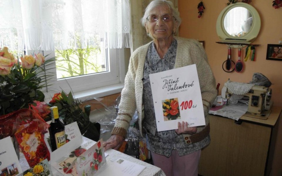 Žatec – Sto let oslavila ve středu 16. dubna obyvatelka Žatce Jiřina Valentová. Popřát k tomuto jubileu jí přišla starostka Zdeňka Hamousová v doprovodu matrikářek Drahuše Laiblové a Andrey Kleczatské. Oslavenkyně se přitom podepsala do kro-niky města.