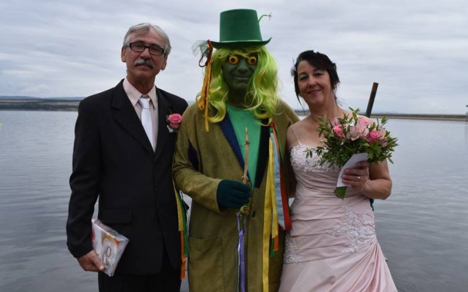 NECHRANICE (r) — Pro Vladanu Humeňanskou a Pavla Majtána ze Žatce je rybaření jejich dlouholetou oblíbenou kratochvílí. Nejčastěji tráví čas u Nechranické přehrady, kde mají chatku. A tak když Pavel Majtán požádal po deseti letech svou milovanou o ruku, jejich přátelé z Petrova cechu a správce kempu U hráze Přemysl Hána s manželkou pro ně připravili příjemné překvapení ve formě netradiční veselky. Kdo jiný mohl na takové svatbě odvést nevěstu než vodník — v civilu také kamarád rybář Bohumil Rybka. Rybářský sňatek posvětil kadaňský místostarosta Jan Losenický. Foto: archiv Bohumila Rybky